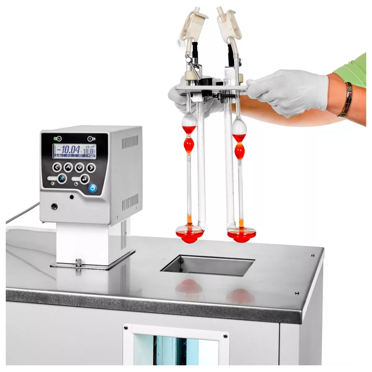- Специальная лампа подсветки, поставляемая в комплекте, обеспечивает хорошую различимость меток вискозиметров внутри ванны термостата — это повышает удобство эксплуатации и достоверность результатов измерений