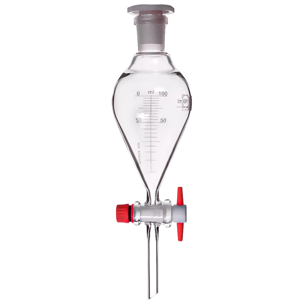 Воронка делительная грушевидная 100 мл с краном PTFE применяется для разделения двух несмешивающихся жидкостей. Воронка комплектуется NS пробкой и краном с пластиковым колпачком. Воронки делительные грушевидные DWK (Schott Duran) соответствуют стандарту DIN-ISO 4800 и изготовляются из стекла марки Duran.