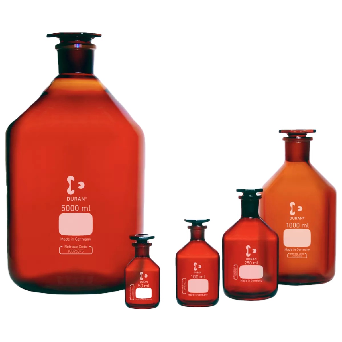 Склянка DWK (Schott Duran) 500 мл, темная, узкое горло предназначена для хранения жидких химреактивов и твердых сыпучих веществ. Склянка состоит только из стеклянных частей и подходит для хранения агрессивных химреактивов которые могут вступать в реакцию с пластиком. Склянки Schott Duran изготовляются из стекла марки Duran и соответствуют ISO 4796-2. На каждую банку нанесен Retrace Code, позволяющий получить сертификат качества на партию через Интернет.