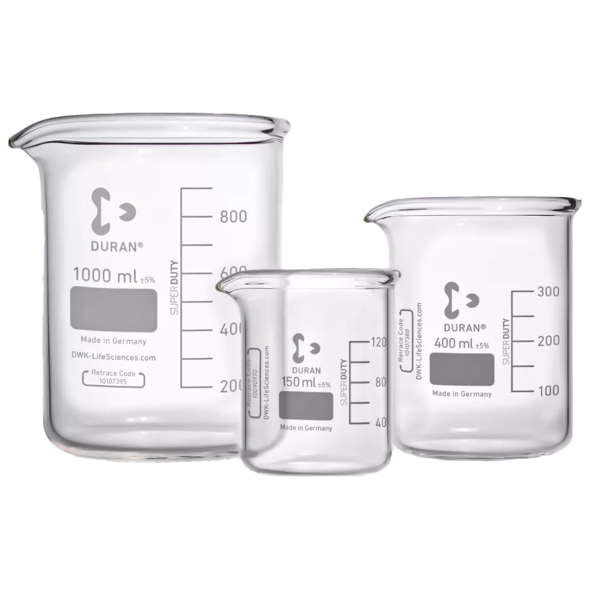 Стакан лабораторный DWK (Schott Duran) ННУ-2000 утолщенный низкий с носиком изготавливаются из стекла марки Duran. Вследствие использования в производстве этих стаканов гораздо большего количества стекла, конструкция имеет улучшенные механические свойства по сравнению со стандартными стаканами. Дополнительным преимуществом изделия является упрочненный край, который так же обеспечивает ударопрочность и значительное снижает риск боя. Однако эти стаканы имеют пониженную термостойкость, что ограничивается их использование для нагрева. На каждый стакан нанесен Retrace Code, позволяющий получить сертификат качества на партию через Интернет и шкала белого цвета, указывающая ориентировочную вместимость.