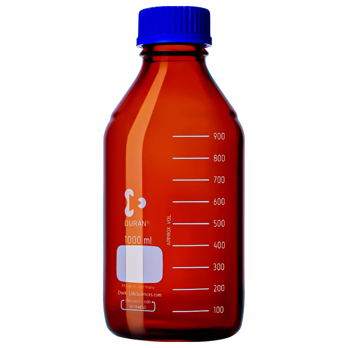 Банка для реактивов с крышкой DWK (Schott Duran) 1000 мл, темное стекло, градуированная предназначена для хранения, фасовки, транспортировки жидких химических реактивов и твердых сыпучих веществ.