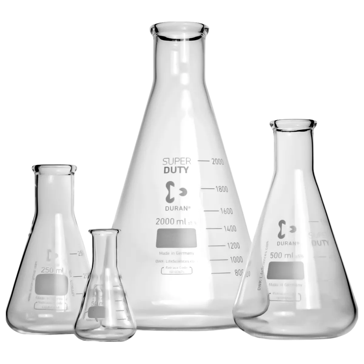Колбы конические утолщенные с узким или широким горлом изготавливаются из стекла марки Duran. Вследствие использования в производстве этих колб большего количества стекла, конструкция имеет улучшенные механические свойства по сравнению со стандартными колбами DURAN. Дополнительным преимуществом изделий является упрочненный край, который так же обеспечивает ударопрочность и значительное снижает риск боя. Однако эти колбы имеют пониженную термостойкость, что ограничивается их использование при нагреве или в условиях резких перепадов температур. На каждую колбу нанесен Retrace Code, позволяющий получить сертификат качества на партию через Интернет. Улучшенные механические свойства по сравнению со стандартными колбами.