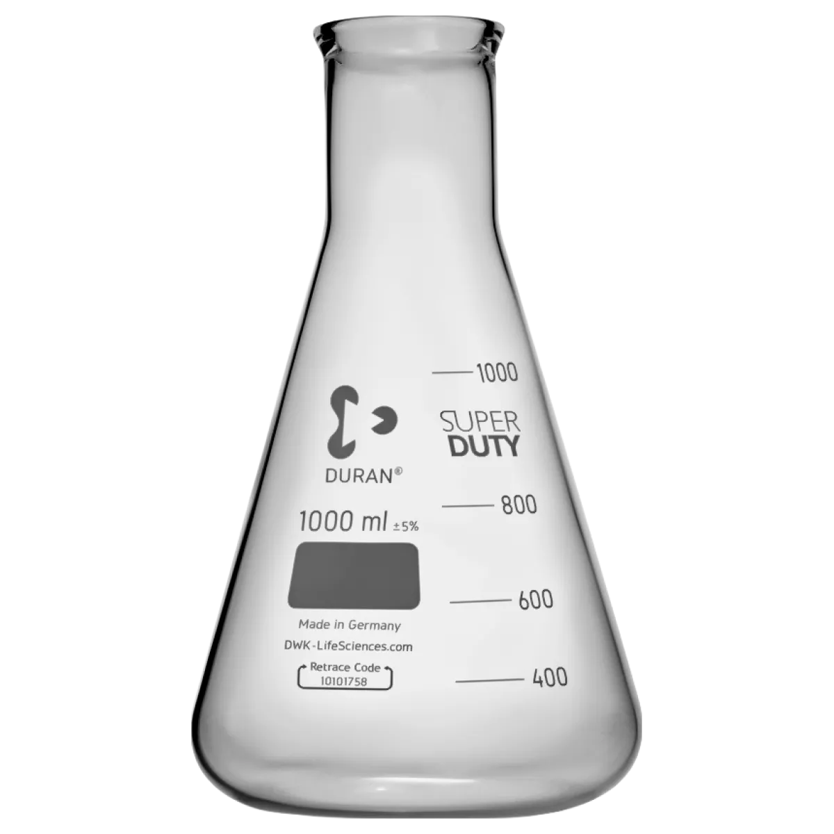 Колба коническая Эрленмейера КНУ-1000-50, DWK (Schott Duran) применяется при проведении различных работ в аналитических, биологических, химических лабораториях в условиях повышенных механических нагрузок. На колбу нанесена шкала и окошко для записи, выполненные из обожженной керамической эмали белого цвета. Колбы конические утолщенные с узким или широким горлом изготавливаются из стекла марки Duran. Вследствие использования в производстве этих колб большего количества стекла, конструкция имеет улучшенные механические свойства по сравнению со стандартными колбами. Дополнительным преимуществом изделий является упрочненный край, который так же обеспечивает ударопрочность и значительное снижает риск боя. Однако эти колбы имеют пониженную термостойкость, что ограничивается их использование при нагреве или в условиях резких перепадов температур. На каждую колбу нанесен Retrace Code, позволяющий получить сертификат качества на партию через Интернет.