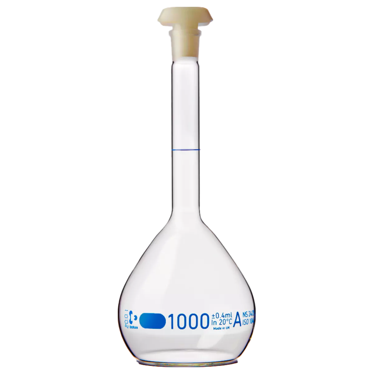 Колба мерная DWK (Schott Duran) 1000 мл 24/29, класс А, с пластиковой пробкой, синяя используется для приготовления растворов и отмеривания точных объемов жидкостей. Колбы мерные Schott Duran производится из стекла марки Duran и соответствуют международному стандарту ISO 1042 класс А. Калибровка производится на наливной объем при t = 20° С. Все колбы комплектуются полиэтиленовыми пробками.