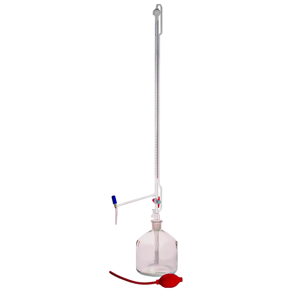 Бюретка с автоматическим нулем 50 мл кран PTFE DWK (Schott Duran) с промежуточным и основным краном из PTFE предназначена для точного отмеривания небольших количеств жидкостей, а также для титрования. Бюретка комплектуется склянкой на 2 л и грушей.