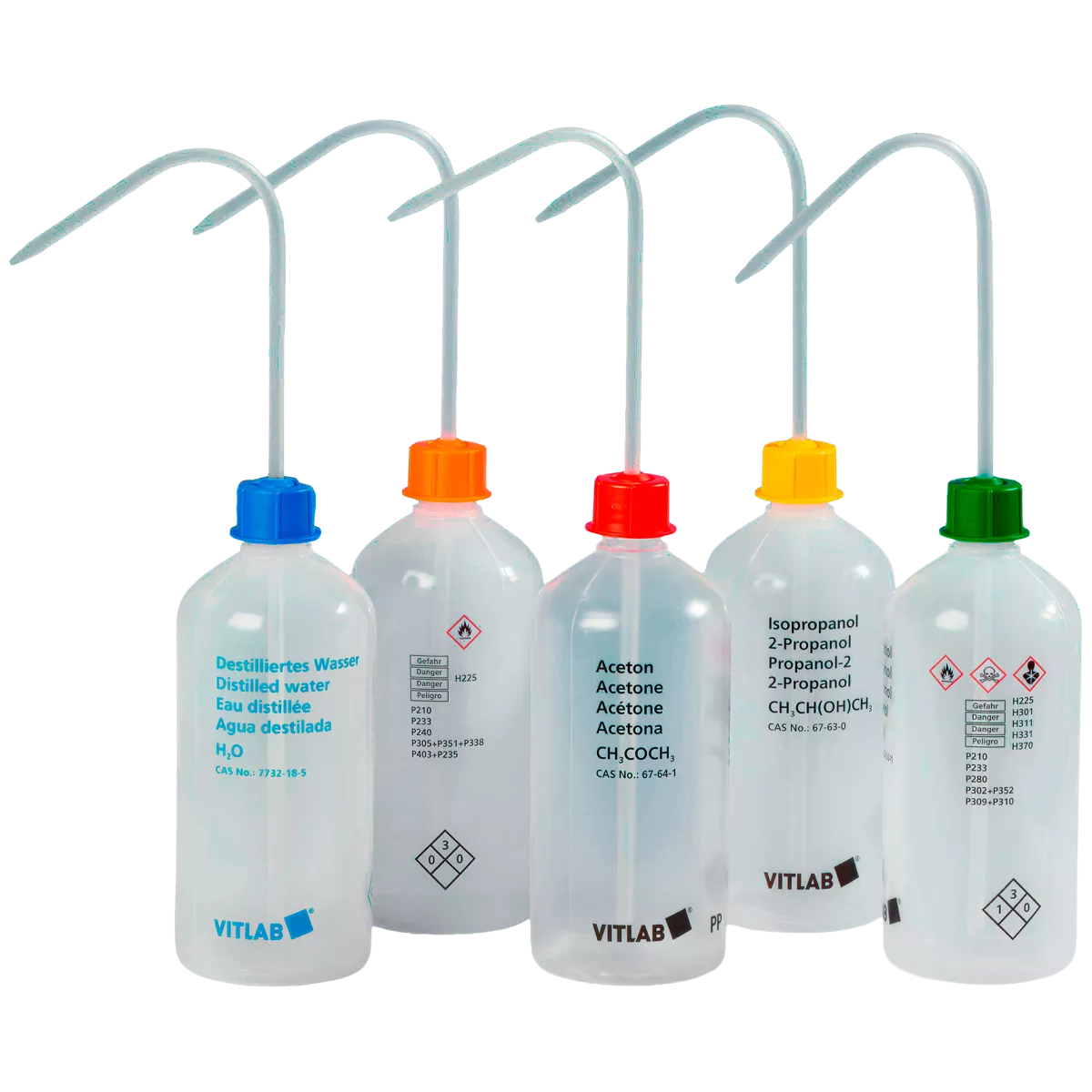Промывалка 500 мл Vitlab VITsafe GL 25 Acetone, узкое горло это удобный и практичный инструмент для обеспечения чистоты, гигиены в лаборатории, используется для промывания или ополаскивания лабораторной посуды, кювет, ёмкостей и поверхностей. Промывалка состоит из бутыли и крышки с герметично закреплённым носиком, который подаёт жидкость тонкой струёй при нажатии. Бутыль изготовлена из полиэтилена низкой плотности PE-LD или полипропилена РР (для ацетона и МЕК), сливная трубка из полипропилена. Маркировка на боковой поверхности промывалки содержит информацию по технике безопасности, наименование вещества на немецком, английском, французском и испанском языках, химическая формула, регистрационный номер CAS, пиктограммой опасности, сигнальное слово, указания на опасность продукта. Вытекание или стекание каплями практически отсутствует, благодаря винтовой крышке VENT-CAP, она почти полностью препятствует созданию статического избыточного давления.