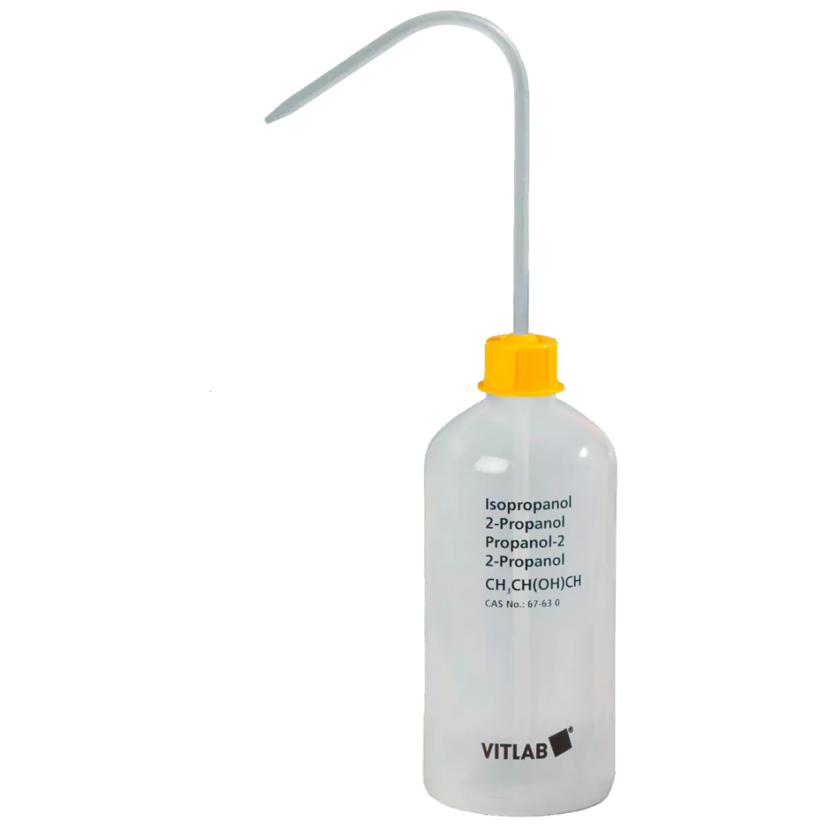 Промывалка 250 мл Vitlab LD-PE VITsafe GL 25, Isopropanol, широкое горло это удобный и практичный инструмент для обеспечения чистоты, гигиены в лаборатории, используется для промывания или ополаскивания лабораторной посуды, кювет, ёмкостей и поверхностей. Промывалка состоит из бутыли и крышки с герметично закреплённым носиком, который подаёт жидкость тонкой струёй при нажатии. Бутыль изготовлена из полиэтилена низкой плотности PE-LD или полипропилена РР (для ацетона и МЕК), сливная трубка из полипропилена. Маркировка на боковой поверхности промывалки содержит информацию по технике безопасности, наименование вещества на немецком, английском, французском и испанском языках, химическая формула, регистрационный номер CAS, пиктограммой опасности, сигнальное слово, указания на опасность продукта. Вытекание или стекание каплями практически отсутствует, благодаря винтовой крышке VENT-CAP, она почти полностью препятствует созданию статического избыточного давления.