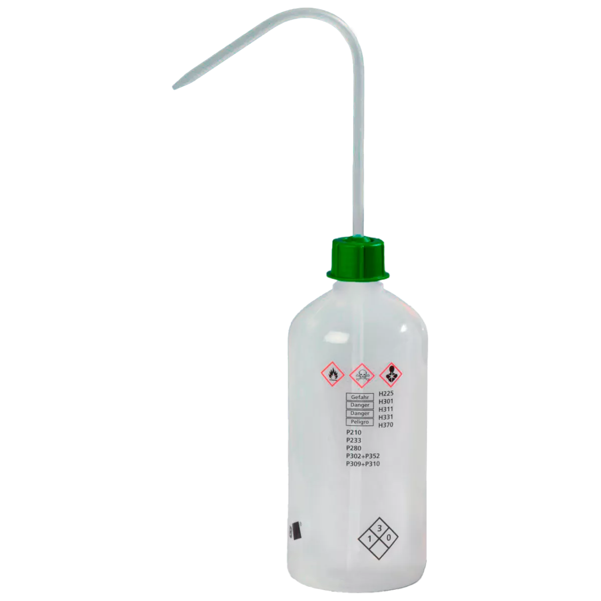 Промывалка 500 мл LD-PE VITsafe GL 25, Methanol, Vitlab, узкое горло это удобный и практичный инструмент для обеспечения чистоты, гигиены в лаборатории, используется для промывания или ополаскивания лабораторной посуды, кювет, ёмкостей и поверхностей. Промывалка состоит из бутыли и крышки с герметично закреплённым носиком, который подаёт жидкость тонкой струёй при нажатии. Бутыль изготовлена из полиэтилена низкой плотности PE-LD или полипропилена РР (для ацетона и МЕК), сливная трубка из полипропилена. Маркировка на боковой поверхности промывалки содержит информацию по технике безопасности, наименование вещества на немецком, английском, французском и испанском языках, химическая формула, регистрационный номер CAS, пиктограммой опасности, сигнальное слово, указания на опасность продукта. Вытекание или стекание каплями практически отсутствует, благодаря винтовой крышке VENT-CAP, она почти полностью препятствует созданию статического избыточного давления.
