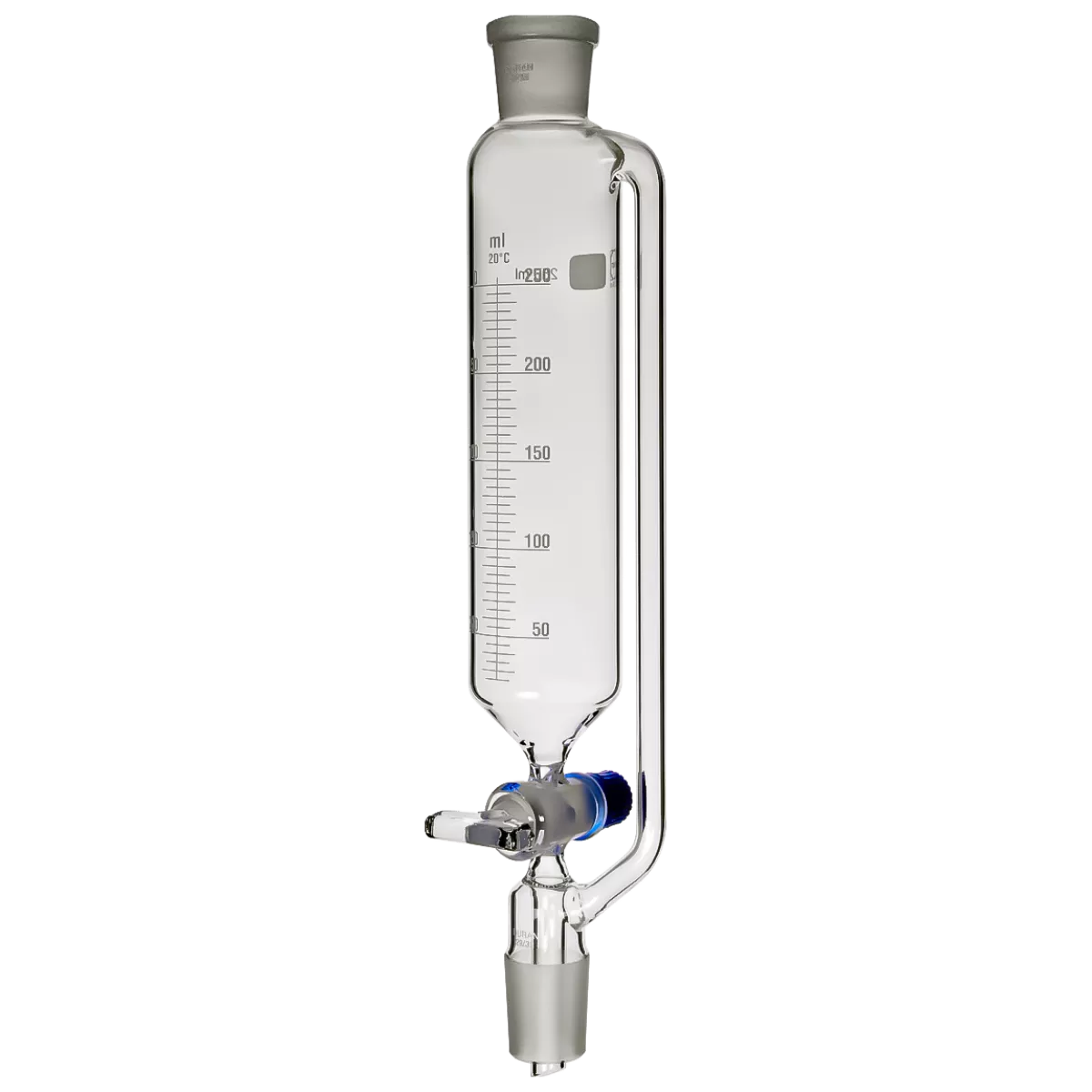 Воронка делительная цилиндрическая с противодавлением DWK (Schott Duran) 250/5 мл 29/32 29/32 применяется для равномерной подачи и дозирования жидкости в реакционную смесь. Скорость подачи можно отрегулировать. DIN 4800.