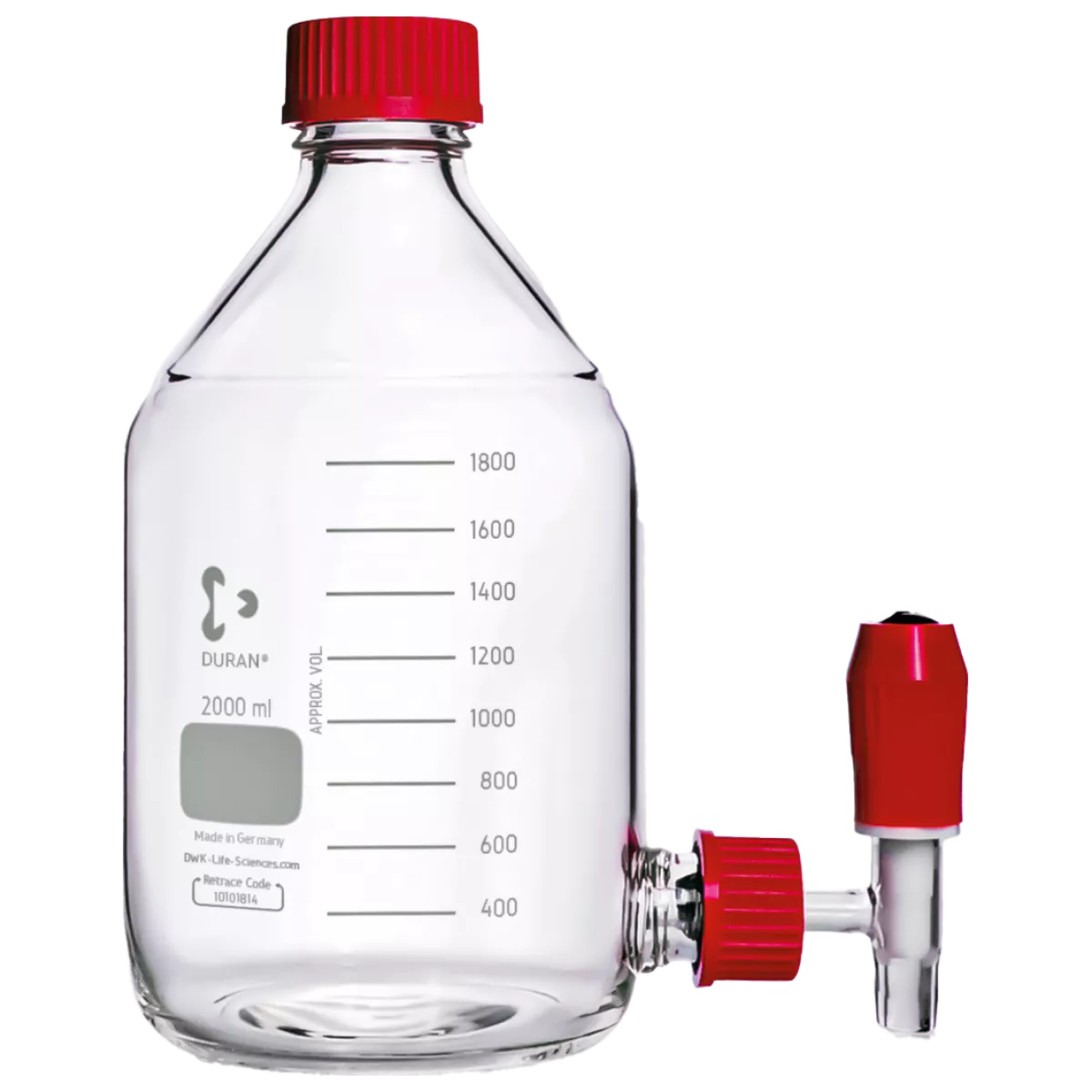 Склянка 2000 мл с нижним тубусом и краном PTFE, DWK (Schott Duran) поставляется в комплекте с винтовой крышкой GL45, силиконовой прокладкой и запорным краном (GL32) со шпинделем из PTFE. Соответствует ISO 4796-3. На каждую склянку нанесен Retrace Code, позволяющий получить сертификат качества на партию через Интернет.