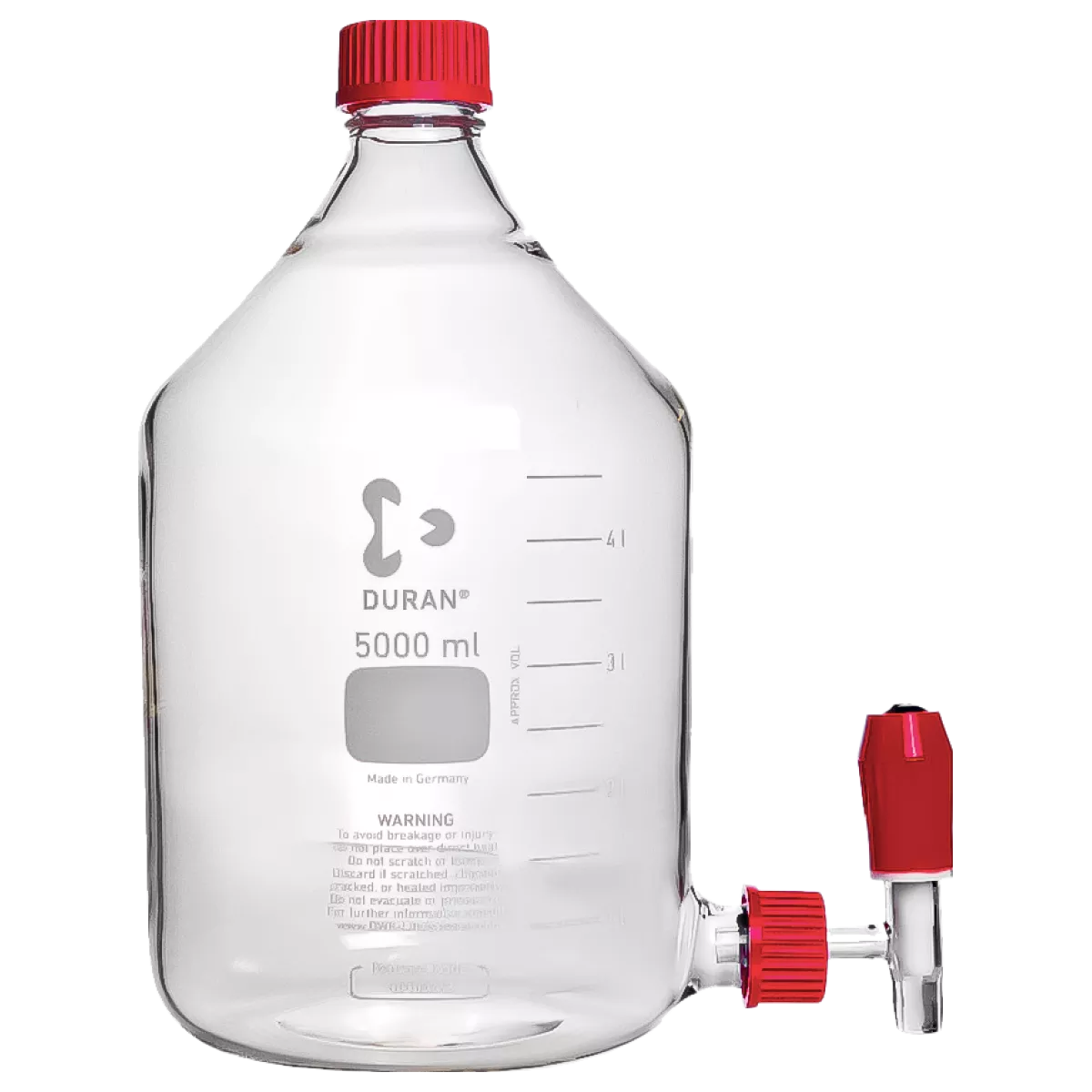 Склянка 5000 мл с нижним тубусом и краном PTFE, DWK (Schott Duran) поставляется в комплекте с винтовой крышкой GL45, силиконовой прокладкой и запорным краном (GL32) со шпинделем из PTFE. Соответствует ISO 4796-3. На каждую склянку нанесен Retrace Code, позволяющий получить сертификат качества на партию через Интернет.
