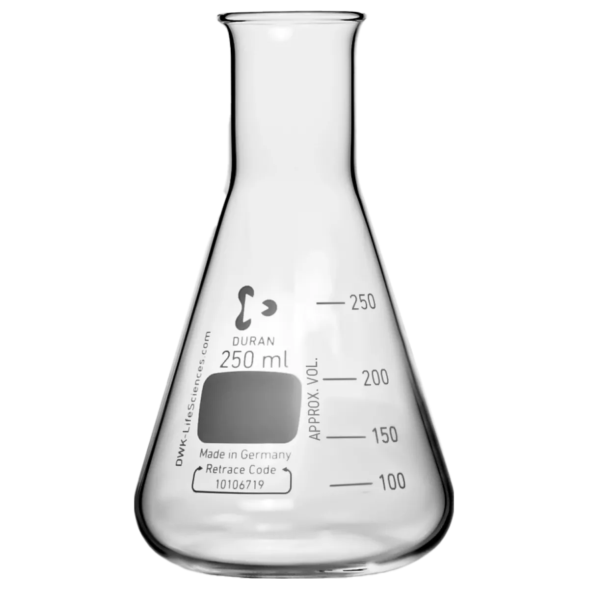 Колба конические Эрленмейера КН-3-250/34, DWK (Schott Duran) применяется при проведении различных работ в аналитических, биологических, химических лабораториях. На колбу нанесена ориентировочная шкала и окошко для записи, выполненные из обожженной керамической эмали белого цвета. Колбы Эрленмейера с узким горлом Duran соответствуют стандарту ISO 1773 и изготавливаются из стекла марки Duran. На каждую колбу нанесен Retrace Code, позволяющий получить сертификат качества на партию через Интернет.