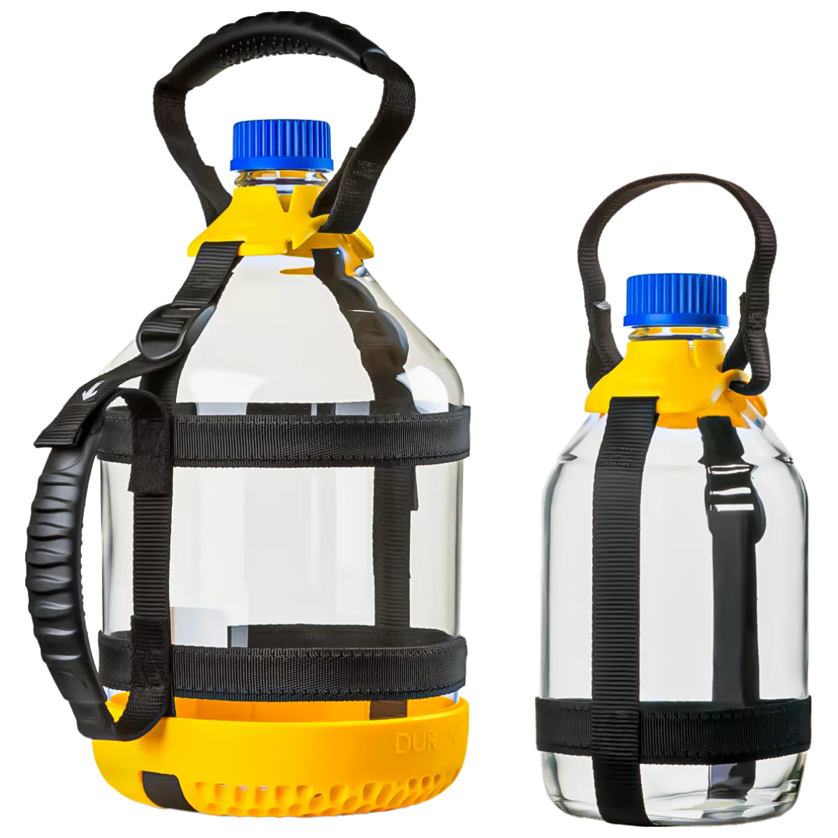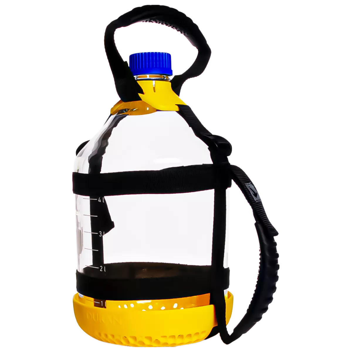 Переноска для бутылей DWK (Schott Duran) с горловиной GL45 объемом 5 л позволяет легко и безопасно переносить бутыли по лаборатории или производству. Данная система позволяет комфортно и безопасно разливать жидкости из больших бутылей. Все материалы полностью автоклавируемы.