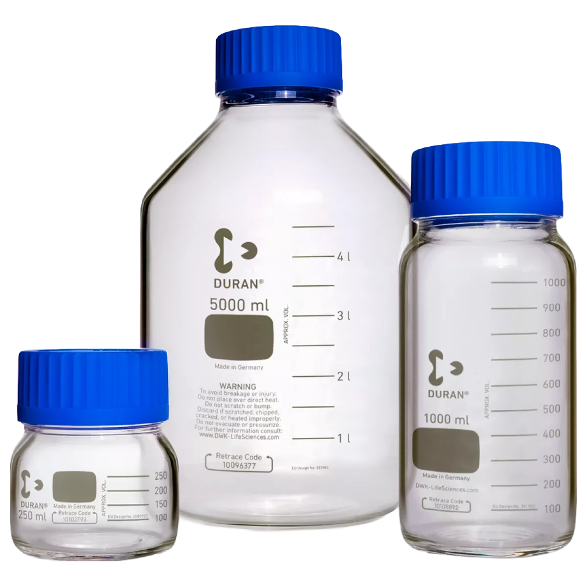 Банки с крышками градуированные широкогорлые Duran имеют диаметр горловины 80 мм и комплектуются сливным кольцом и специальной крышкой из РР. На каждую банку нанесен Retrace Code, позволяющий получить сертификат качества на партию через Интернет. Банки могут поставляться без крышек.