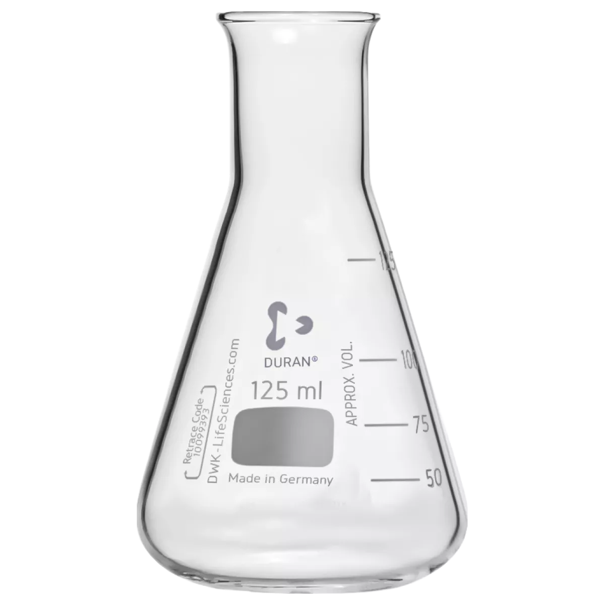 Колба коническая Эрленмейера КН-3-125/28, DWK (Schott Duran) применяется при проведении различных работ в аналитических, биологических, химических лабораториях. На колбу нанесена шкала и окошко для записи, выполненные из обожженной керамической эмали белого цвета. Колбы Эрленмейра с узким горлом Duran соответствуют стандарту ISO 1773 и изготавливаются из стекла марки Duran. На каждую колбу нанесен Retrace Code, позволяющий получить сертификат качества на партию через Интернет.