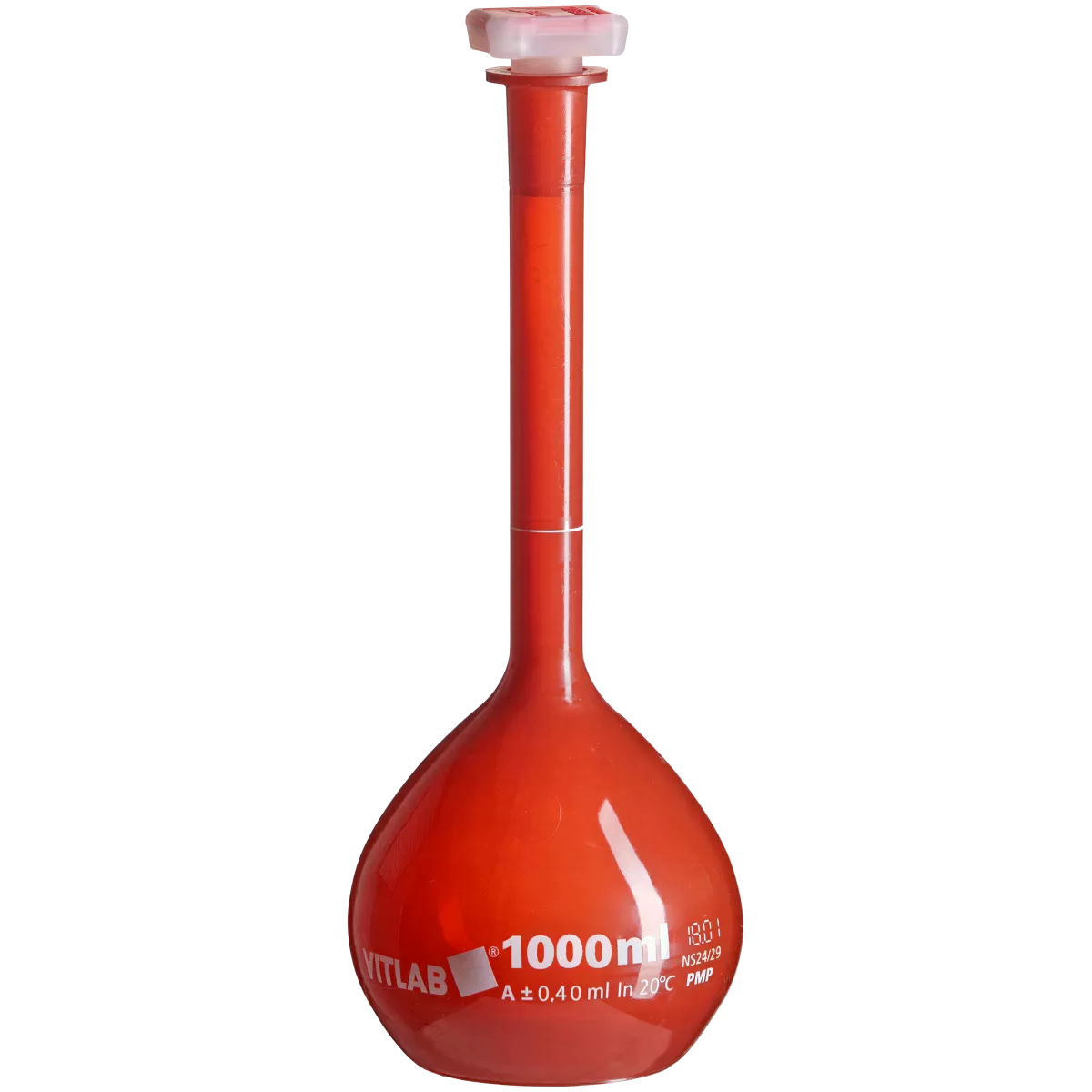 Колба мерная 1000 мл PMP класс А ,темная, Vitlab с притертой пластиковой пробкой предназначена для работы со светочувствительными веществами и обеспечивают защиту для чувствительных веществ в диапазоне 200-750 нм. Колба производится из полиметеилпентена PMP с пробкой из полипропилена РР, имеет индивидуальную калибровку на ‘In’ (наливной объём) и кольцевую метку. Погрешности измерения соответствует классу А согласно DIN EN ISO 1042. На колбу нанесён номер партии, имеется сертификат о калибровке на партию. Вид пластика PMP — полиметилпентен - это кристально-прозрачный, жесткий термопласт, его строение аналогично РР, но отличает повышенная температурная стабильность от 0 до +150°С, хорошая прочность и формоустойчивость, исключительная химическая стойкость. Допускается стерилизация паром при 121°С в течение 20 минут, газом (этиленоксид), химическая (формалин, этанол), β- /γ- излучение.