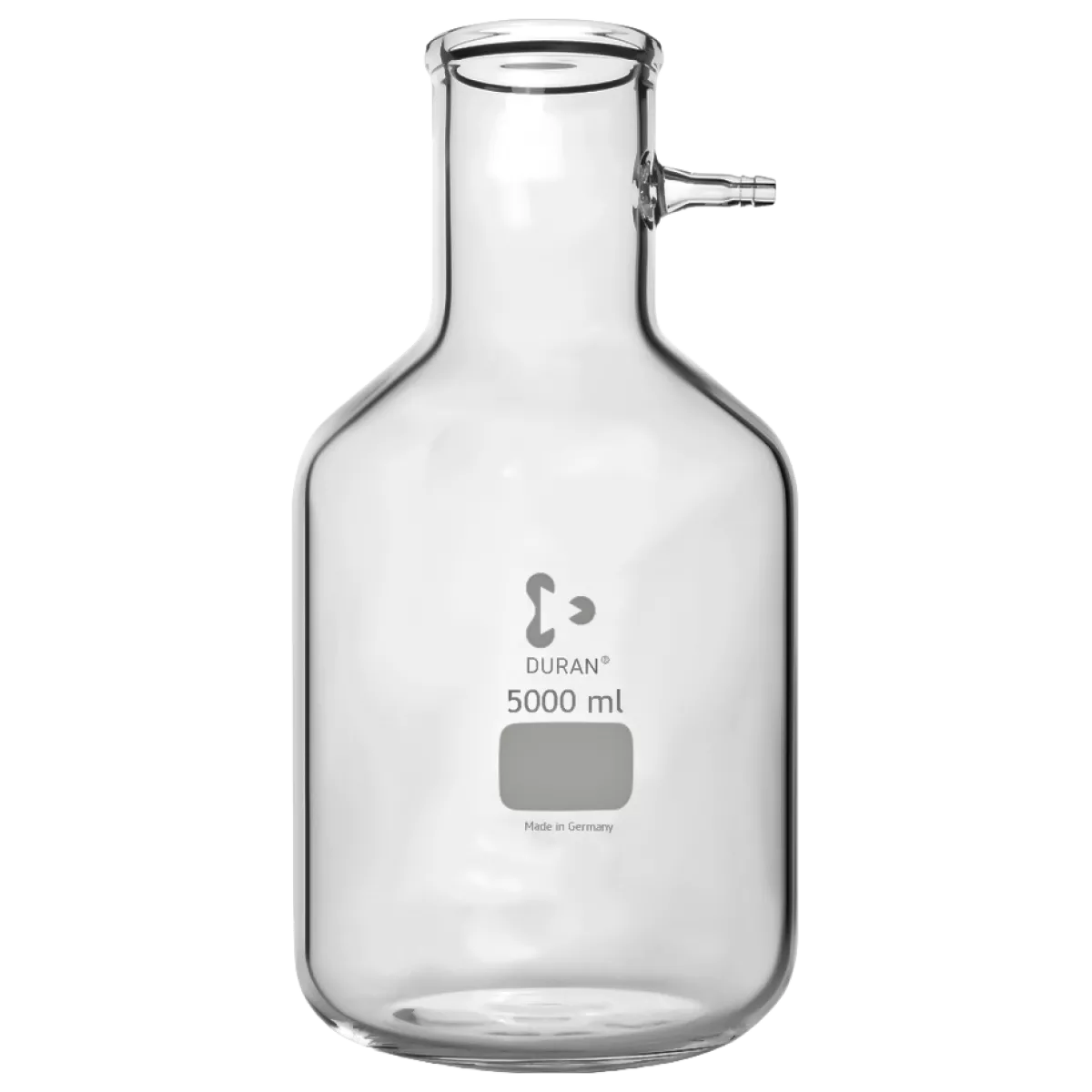 Колба Бунзена 5000 мл, Schott Duran, со стеклянным отводом выпускается в 3-х исполнениях: со стеклянным отводом под шланги (ISO 6556), с пластиковым отводом под шланги (ISO 6556, DIN 12476) и со шлифованным отводом 17,5/26 (ISO 6556, DIN 12476). Все колбы производятся из стекла марки Duran.
