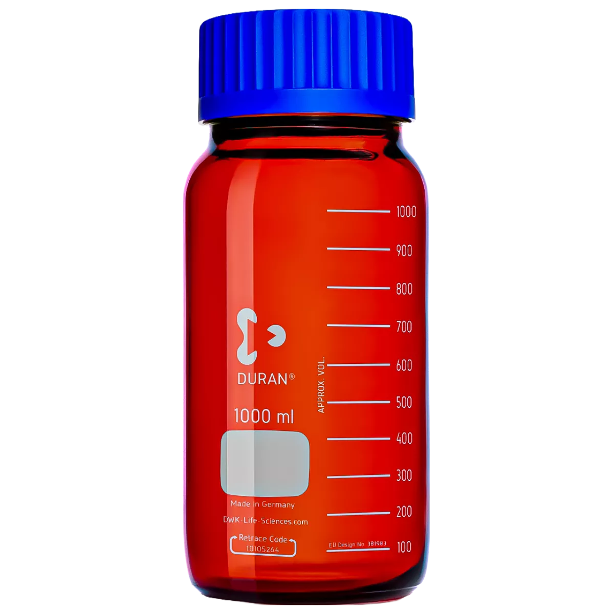 Банка для реактивов с крышкой DWK (Schott Duran) 1000 мл градуированная широкогорлая GLS 80 из темного стекла предназначена для хранения, фасовки, транспортировки жидких химических реактивов и твердых сыпучих веществ.