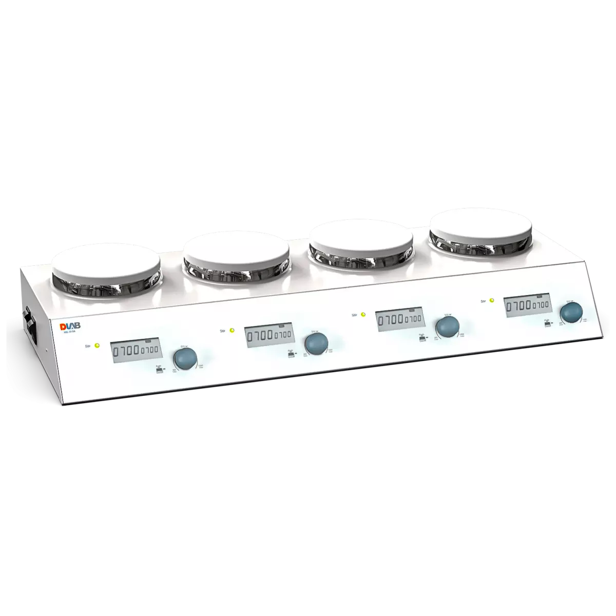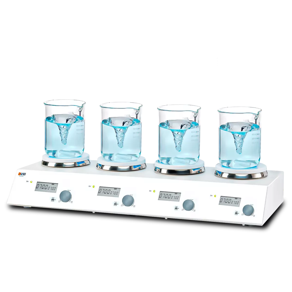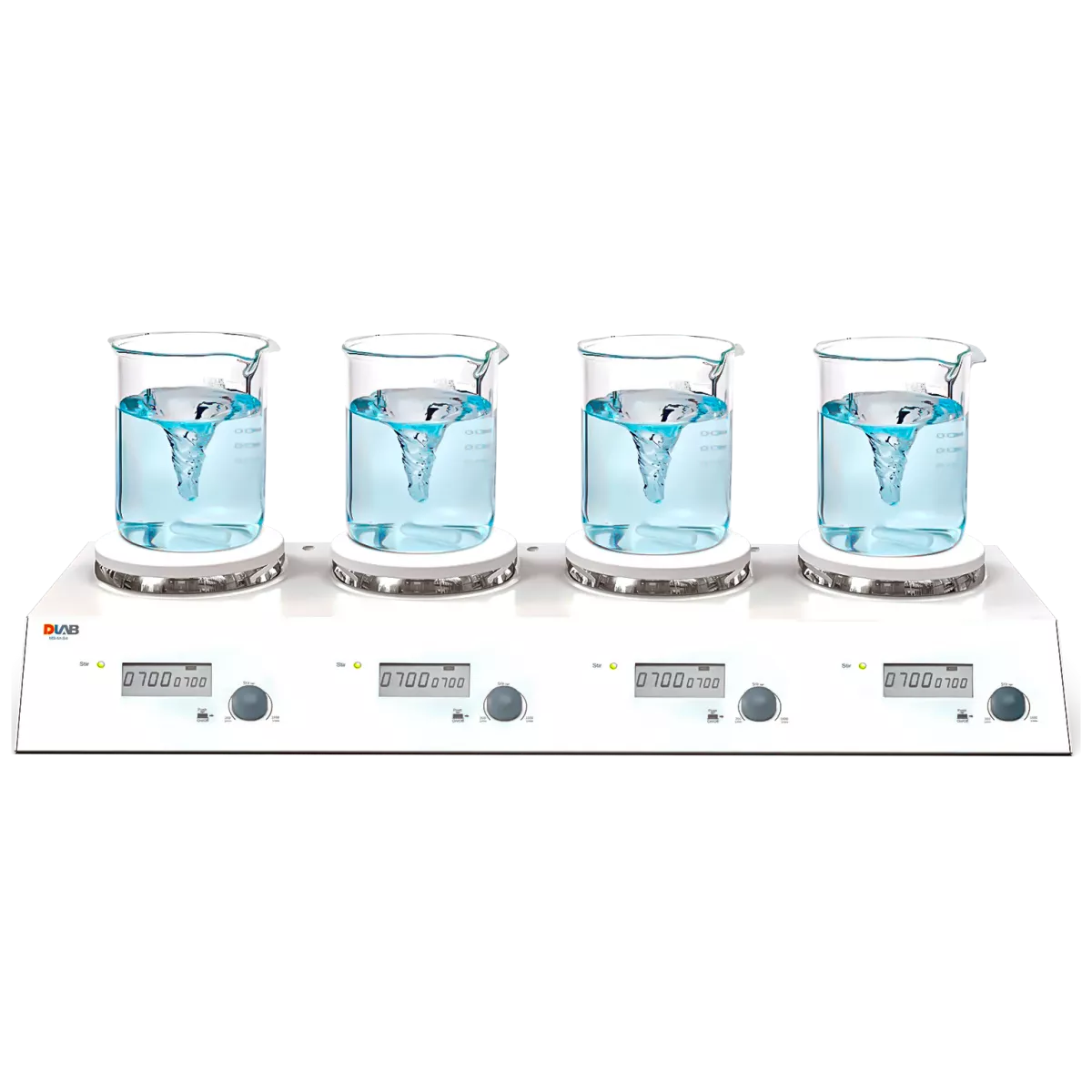Мешалка магнитная DLabMS-M-S4 многоместная применяется для перемешивания жидкостей объемом до 3 л на одну позицию в лабораториях.