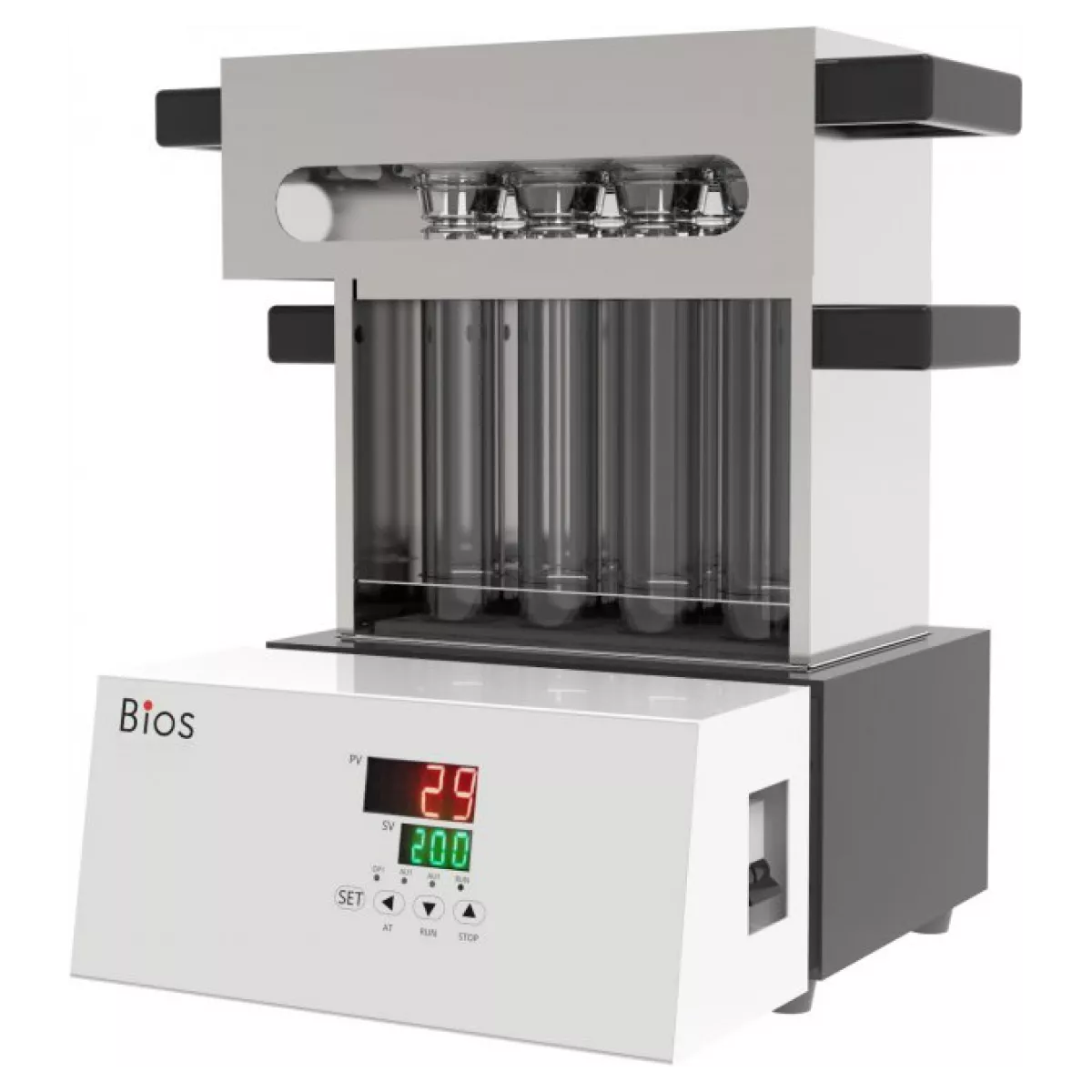Дигестор (термореактор) полуавтоматический SPD108G, Bios – установка минерализации, печь мокрого озоления. Применяется в аналитических лабораториях фармацевтической, пищевой и других отраслей для разложения (озоления) органики. Основной метод, в котором используются дигесторы – анализ по Кьельдалю. В ходе этого испытания для количественного определения белка требуется сжигание образцов в серной кислоте. Поэтому основная задача дигестора - отведение испарений серной кислоты, являющихся опасными для дыхательных путей. Для этой цели каждая модель должна быть оснащена коллектором для отвода паров – скруббером.