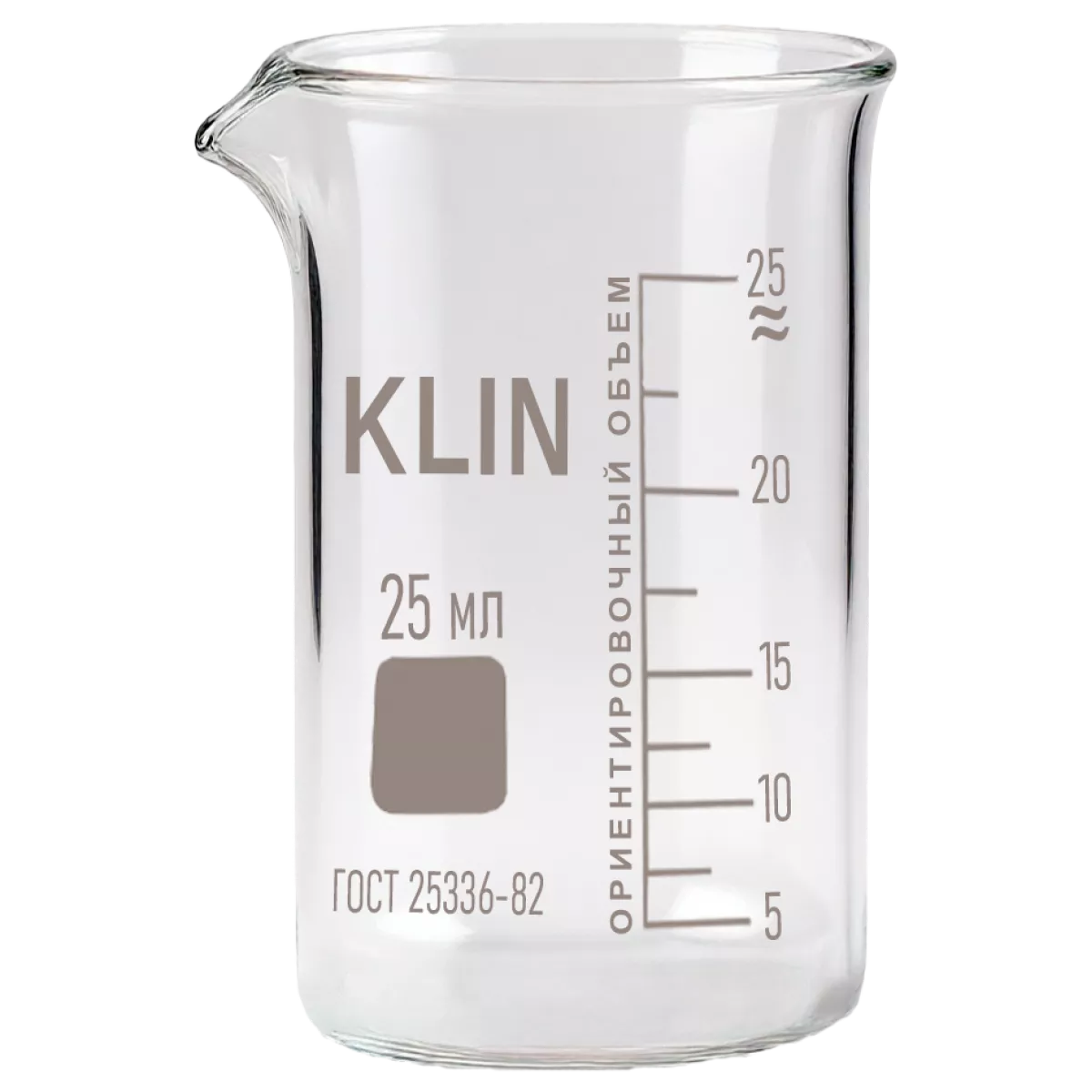 Стакан лабораторный KLIN В-1- 25 предназначен для проведения различных аналитических работ, приготовления растворов, подогревания жидкостей, ориентировочного отмеривания жидкостей и т.д. Выпускаются со шкалой, означающей ориентировочную вместимость.