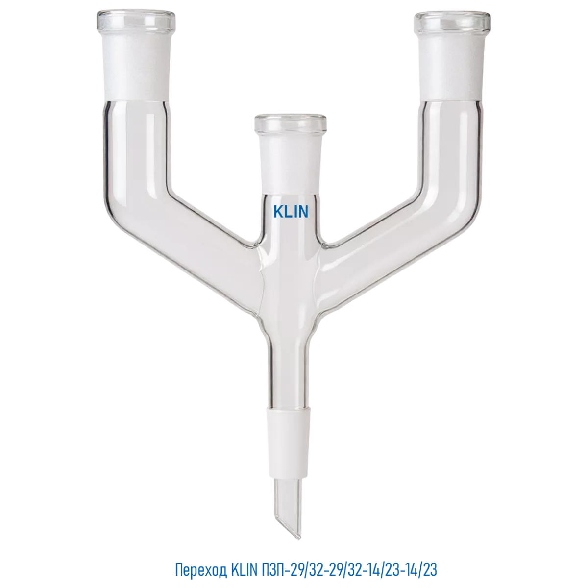 Переход KLIN П3П-29/32-29/32-14/23-14/23 с тремя параллельными горловинами относится к соединительным элементам и предназначен для сборки приборов, аппаратов и установок при переходе от одного конуса к другому.