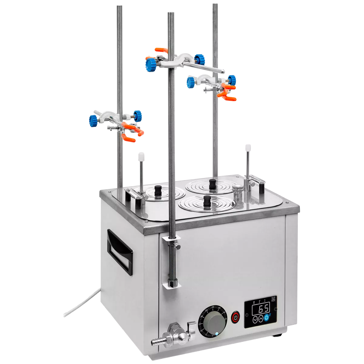 Баня лабораторная Термэкс ЛБ32-Ш водяная трехместная - прибор для равномерного нагревания образцов в стаканах, колбах и другой лабораторной посуде, когда не требуется высокая точность поддержания температуры.