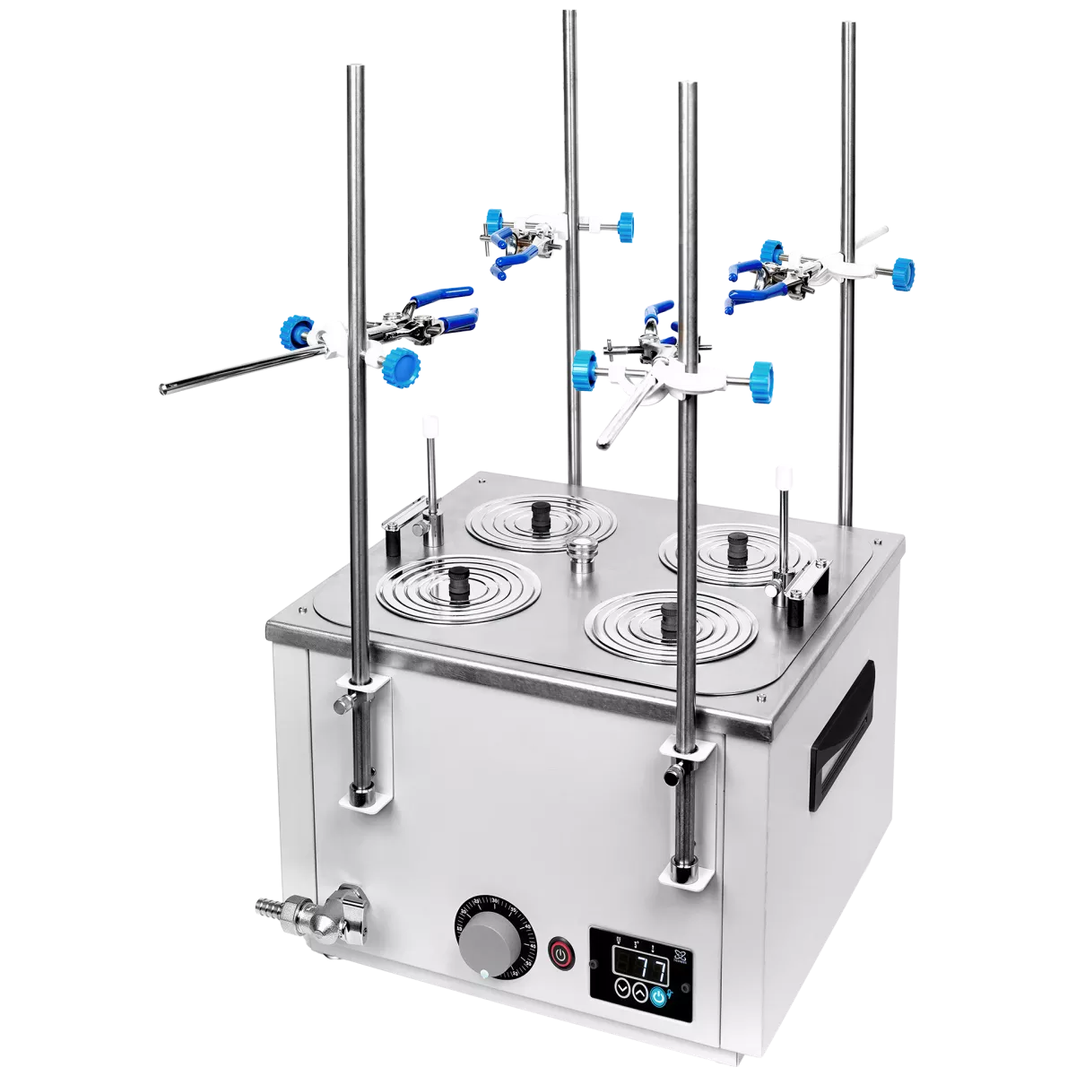 Баня лабораторная Термэкс ЛБ42-Ш водяная четырехместная - прибор для равномерного нагревания образцов в стаканах, колбах и другой лабораторной посуде, когда не требуется высокая точность поддержания температуры.