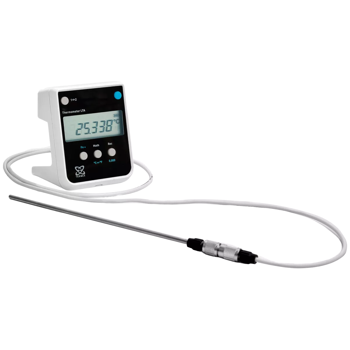 Термометр лабораторный электронный LTA-НТ Термэкс предназначен для контактного измерения температуры умеренно агрессивных жидких, сыпучих и газообразных сред. Корпус датчика температуры выполнен из титановового сплава.